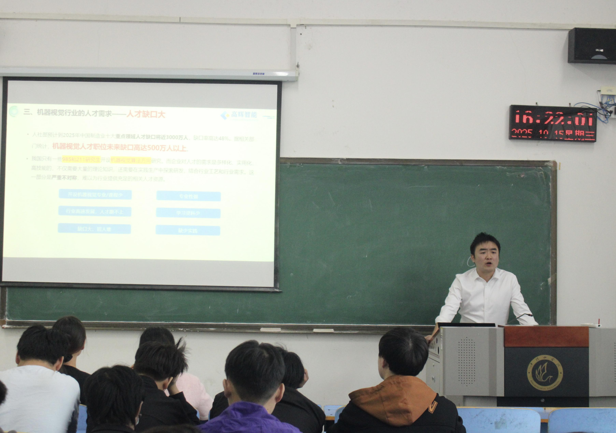 本次活动围绕五大核心板块展开,首先解读“AI机器视觉”风口行业的现状与发展前景,帮助学生拓宽就业方向选择;随后分析当前应届毕业生就业难的核心原因,引导学生建立有助于提升职场竞争力的自我认知,同时提供针对性的就业准备建议与简历优化指导,切实解决求职材料中的常见痛点,还系统讲解面试流程与应答技巧,助力学生规避面试中的典型问题,最后介绍企业明年春季岗位的招聘计划、具体要求及申请通道,为学生提供明确的求职目标。